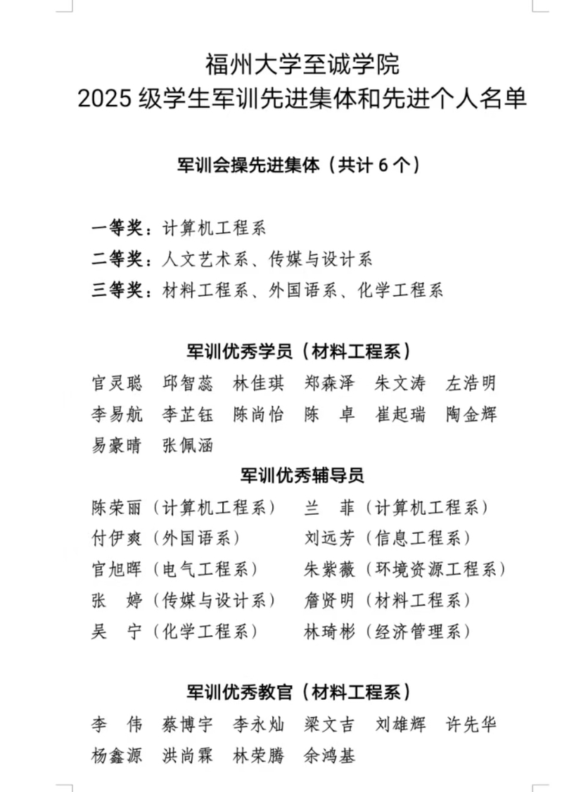 我系荣获“军训会操先进集体”,官灵聪等14位同学荣获“军训优秀学员”,辅导员詹贤明荣获“军训优秀辅导员”,李伟等10位同学荣获“军训优秀教官”,具体名单附后。